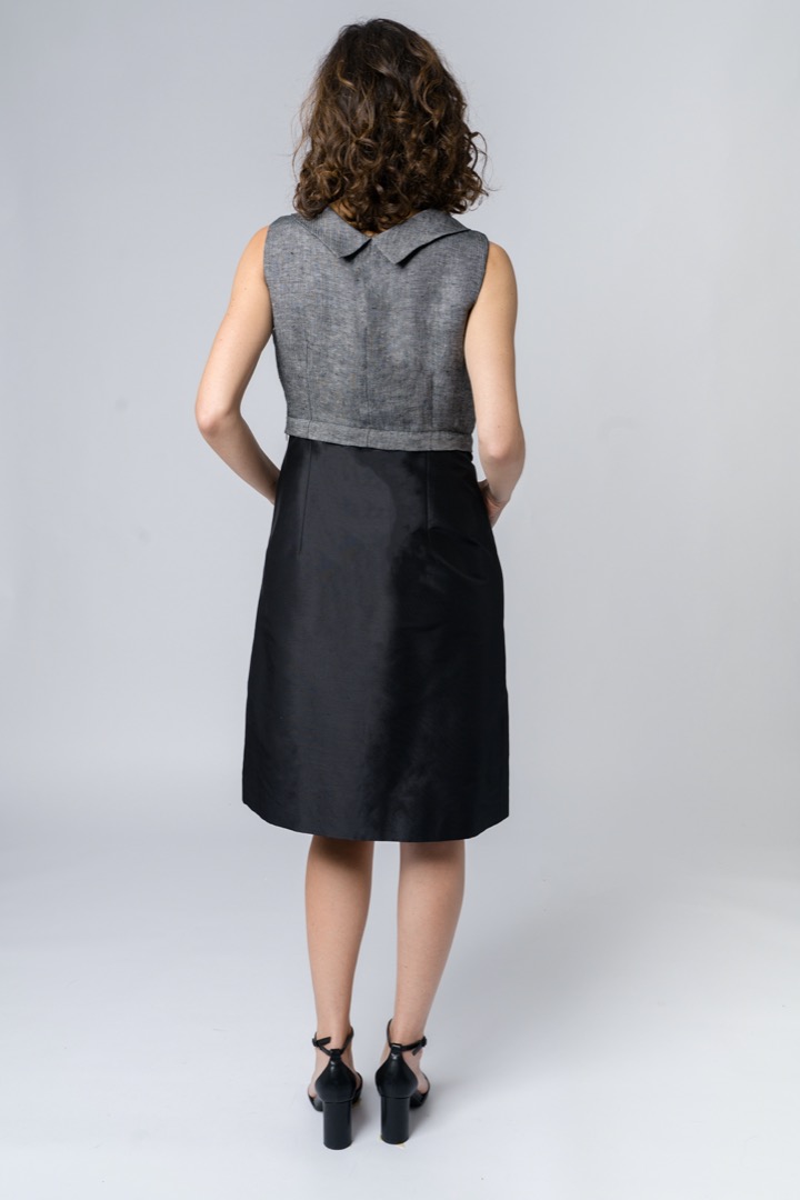 Sleeveless rolled collar top in black. Yarn-dyed hemp by an artisan company based in Milan, a natural and sustainable fabric, soft and comfortable. Fully lined in jacquard viscose by Varese textile district. Tailoring production in small continuative series.