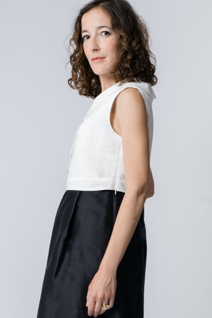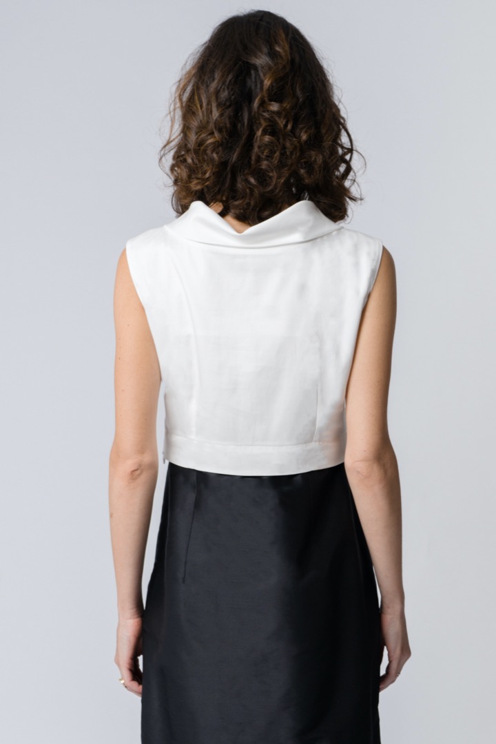 Sleeveless top with shirt collar and buttons, in white. Sateen cotton from Como textile district, a fresh and very soft fabric, perfect for the summer season. Fully lined in jacquard viscose by Varese textile district. Tailoring production in small continuative series.